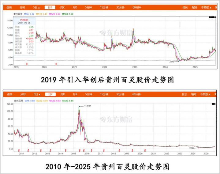 股价表现方面,华创证券进驻贵州百灵后,股价开始跌跌不休,2024年6月底最低达2.98元,摘帽后,最高也才一度达到6.94元,与此前水平相差悬殊。