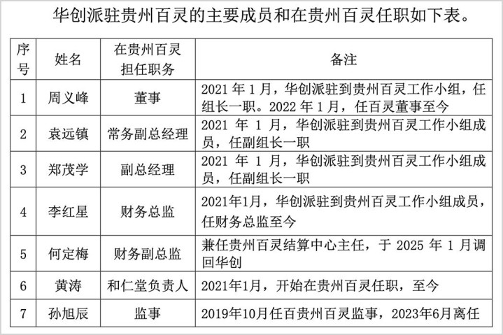 其二,材料显示,2021年开始,华创证券方面以工作组名义向贵州百灵派出20余人,在多个核心岗位担任重要职务,其中涉及董事、监事、常务副总、副总、财务总监和结算主任等高管。